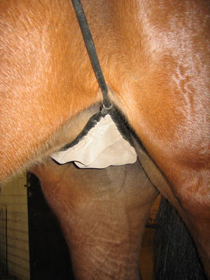| Kivessuoja suojaa oriin kiveksiä maasta irtoavalta hiekalta. |